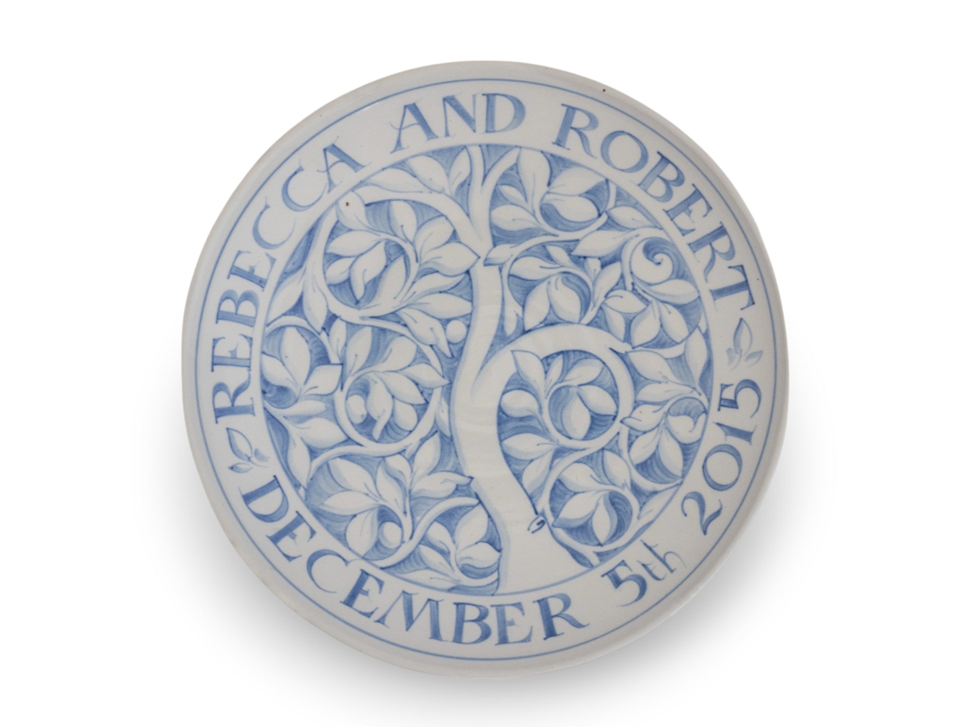 A couple’s first names are hand painted on the flat rim of the plate, with the date of the event at the bottom (example: May 20th 2025), and a standard decoration of choice.