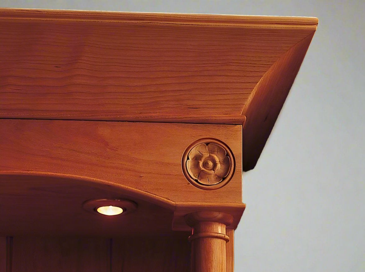 Available with optional overhead lighting system with dimmer in upper case. Hand-carved rosettes around upper case