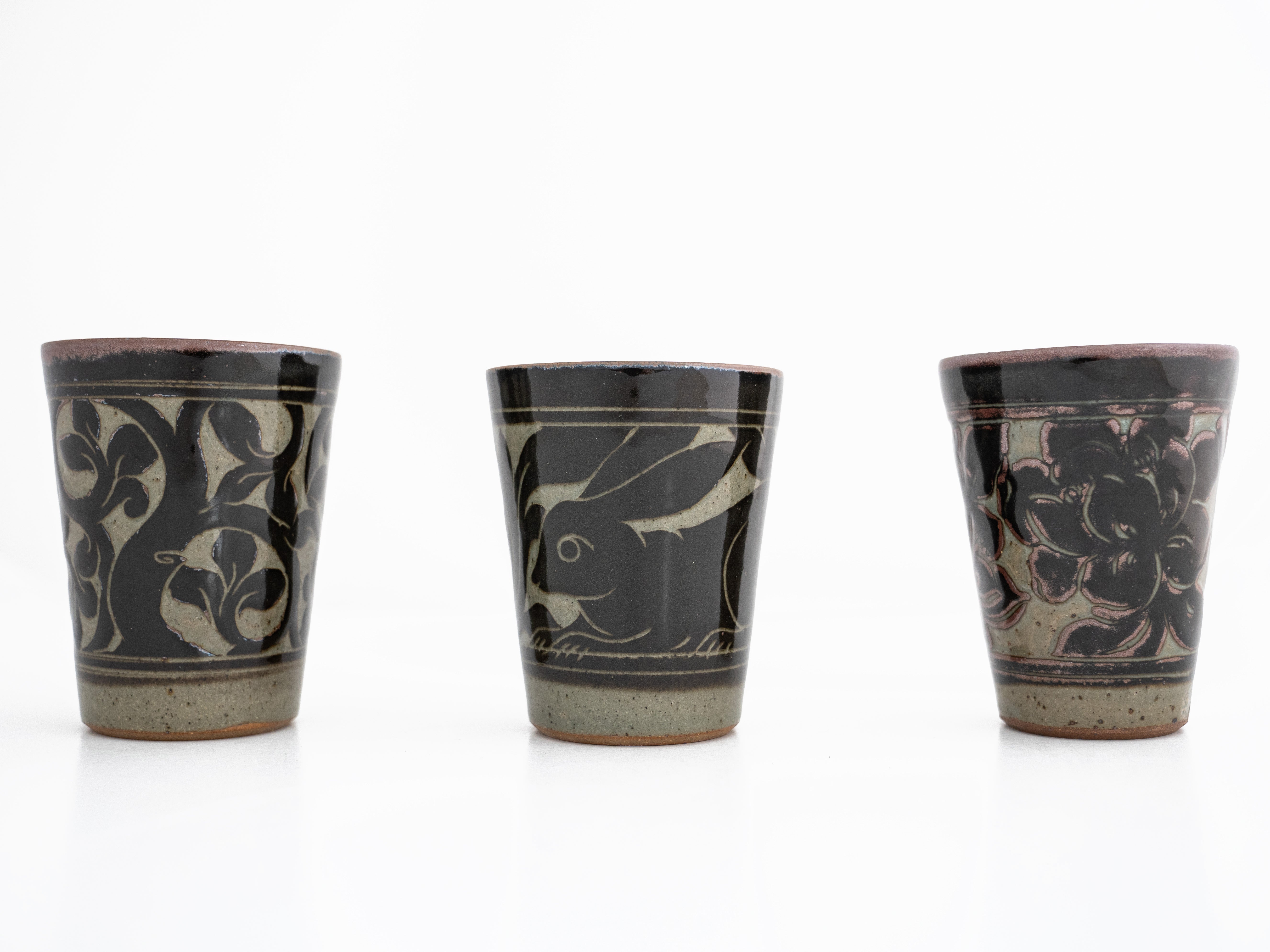 Every beaker is individually hand thrown, dipped in slip, freehand decorated and carved. Each one is a true original, therefore no two are exactly alike.
