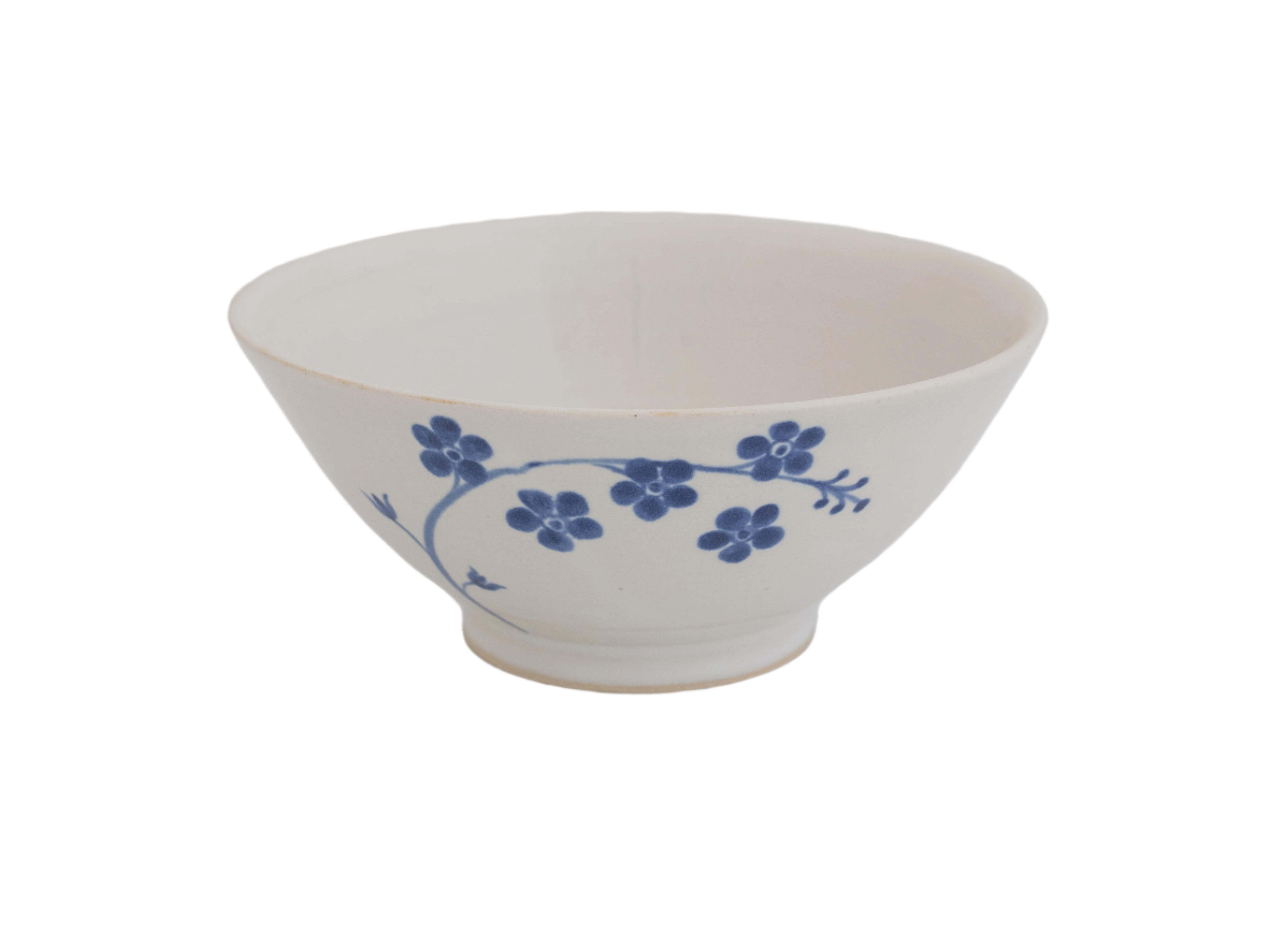 Every bowl is individually hand thrown, dipped in white glaze, and hand painted with fresh cobalt blue forget-me-nots. Each one is a true original, therefore no two are exactly alike.