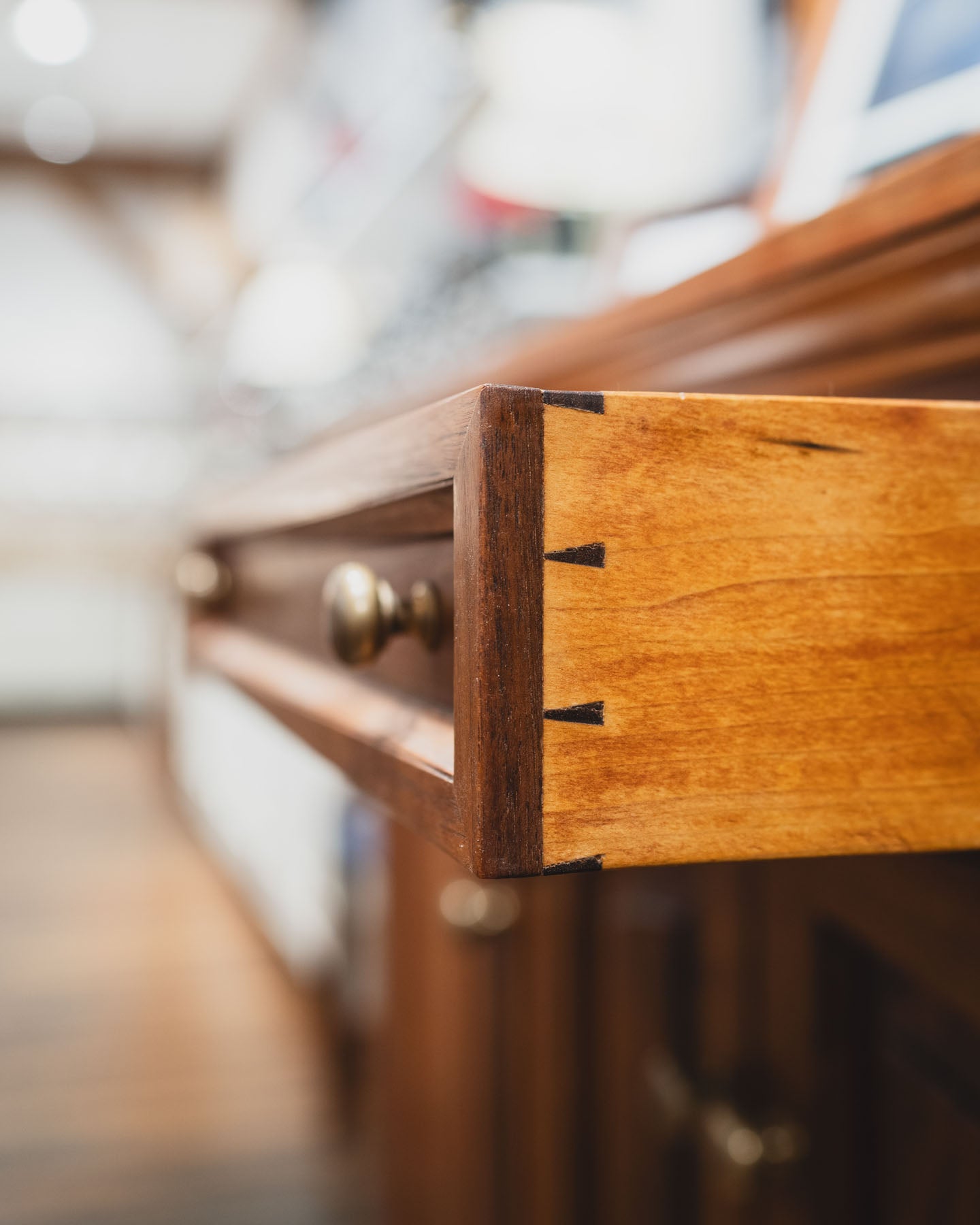 Dovetails are one of the last vestiges of handmade furniture. These days there are fancy machines to be able to cut them, but a machine makes them quite coarsely. Our dovetails, unusually, are cut almost entirely by hand. The reason we have decided to do this is because they are often looked at as important feature and test of the best handmade furniture. But also because we are able to achieve a much more refined looking dovetail. I was always told that in traditional English furniture from 200 years ago, the dovetails were meant to be discreet and almost invisible. But then they became exaggerated as people tried to prove that their furniture really was handmade. I was also told recently that European dovetails are at a finer angle (7 degrees, versus American dovetails which were 14 degrees angle). What you really need to know about dovetails is that they are a very clever “device” or joint, with which to join two pieces of wood at an angle. In the old days, there were a lot more per drawer, (labor was cheap and wood was the expensive part). We don’t do so many per drawer, but they are still a very strong joint. They are a very time-consuming details, but we think they are exceptionally beautiful.