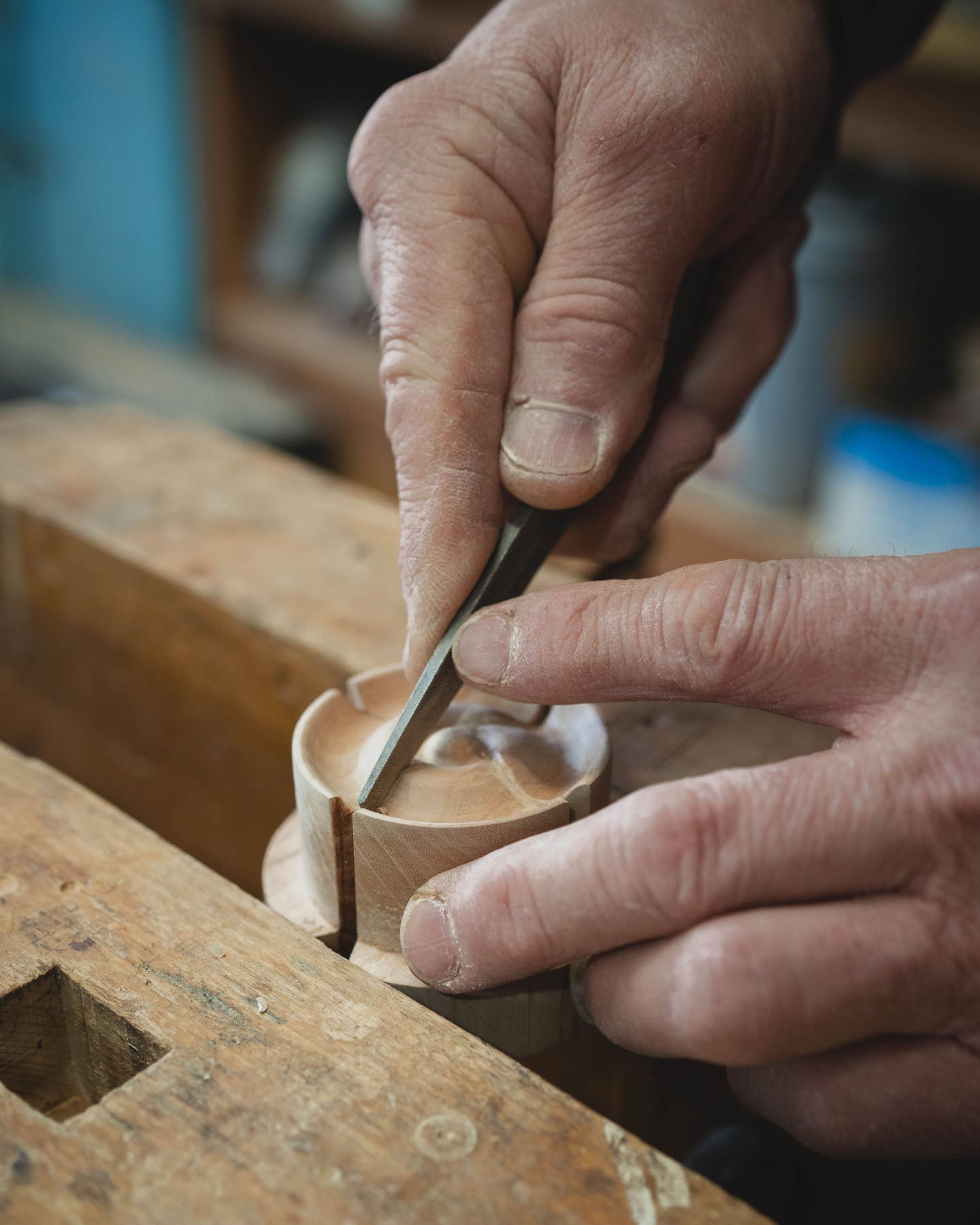 Some people love decoration, some people like plain and simple. Some consider it the difference between traditional and modern. I think that’s just a point of view. I guess I am between the two. What I will tell you is that there are many, many of our customers who LOVE this decoration. It is romantic in title and looks. We named it after our good friend, Juliet Grant-Suttie, who ordered a piece from us, and we wanted to honor her inspiration and kindness. And then there’s Shakespeare. The rose is designed after the “wild Irish rose, Rosa rugosa, which has five petals and a nod to my wild Irish childhood. And yes, there is a ton of handwork right there. We turn a blank on the lathe to give the essential rotary features and then carve in the overlapping petals. Sometimes we gold leaf these flowers for an extra glamorous flourish. (add photo). As to the leaves, which our draftsman rudely calls, ‘weeds”, (and that’s kind of stuck -unfortunately). These are no ordinary garden weeds. We mold the basic longitudinal pattern on a molding machine, and then we come along and nip out the spaces between the leaves and then, most importantly, carve the central vein, with a “V” shaped chisel. If you look, this little carved ‘V” makes the difference between an amateurish leaf and one that is truly alive.