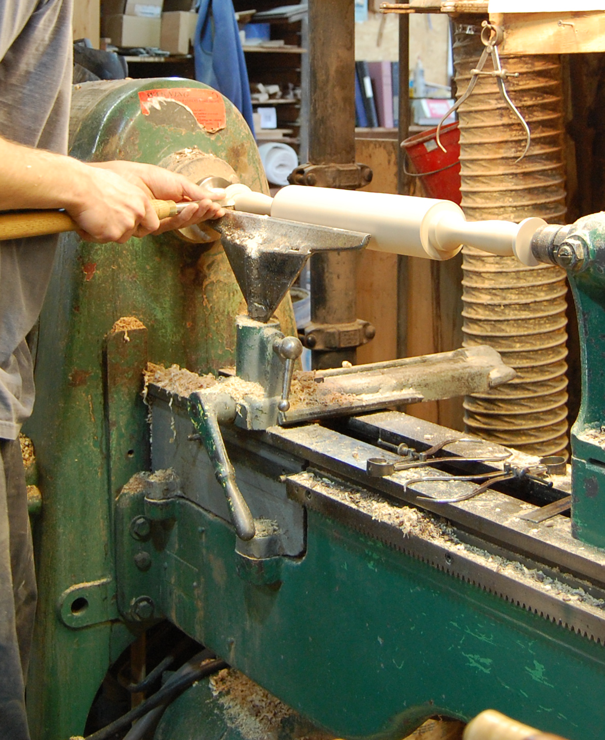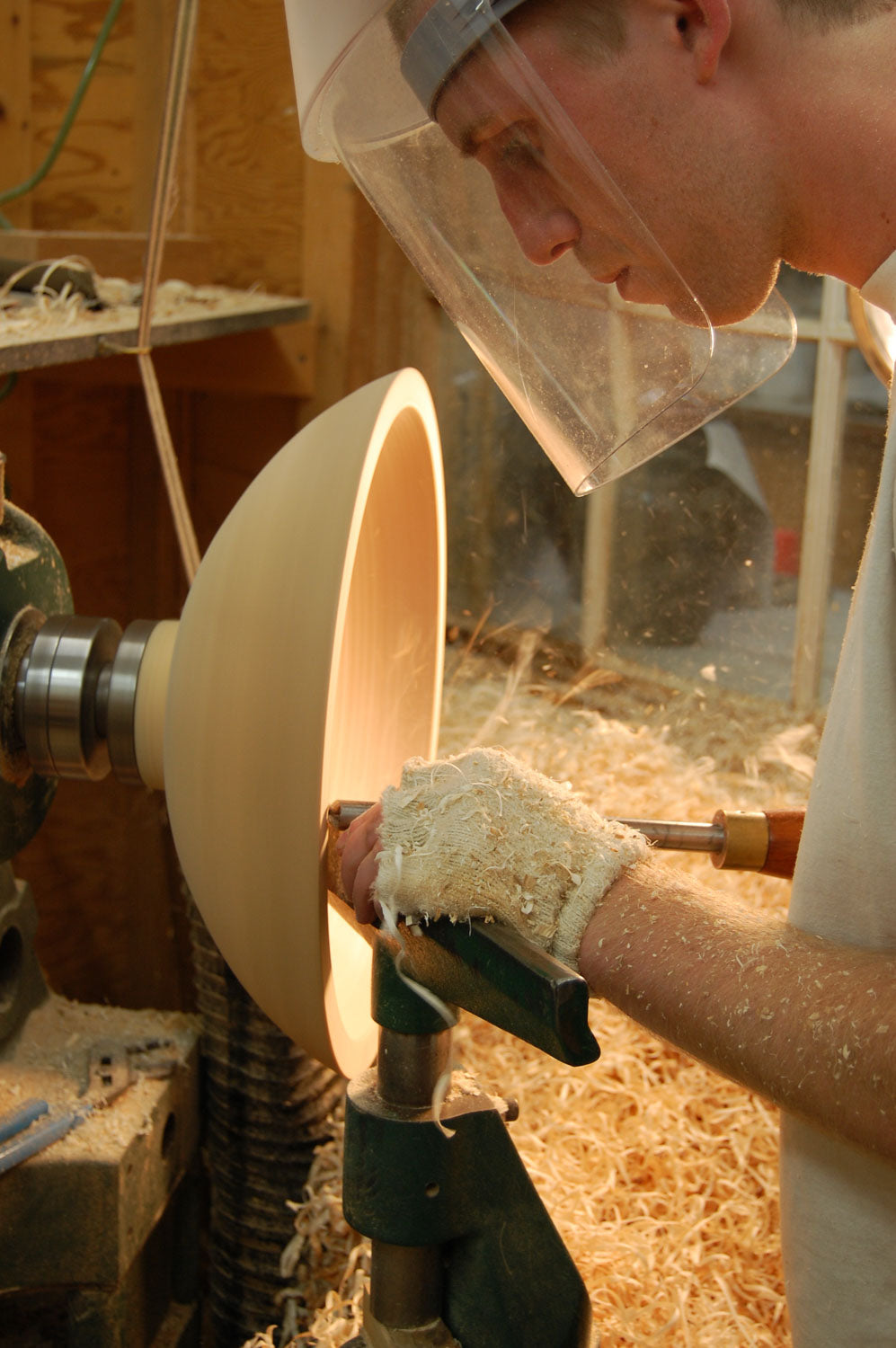 Turning on the lathe, where the wood is held on a spinning motor and shaped with a sharp tool, is really the only way to make a round shape. Whether it is a column, as in our Josh’s Tables or wooden lamps, or hollowed out, like our green turned bowls, hand turning creates a graceful, sculpted form. All of our knobs are hand turned, as well! Details make the piece!