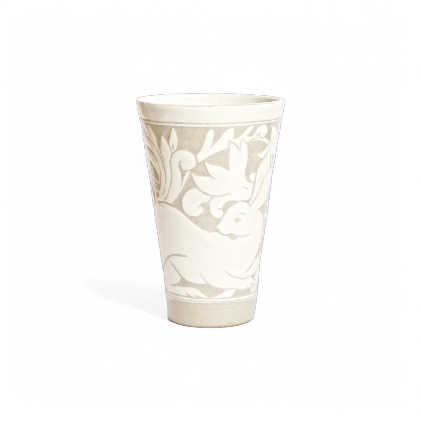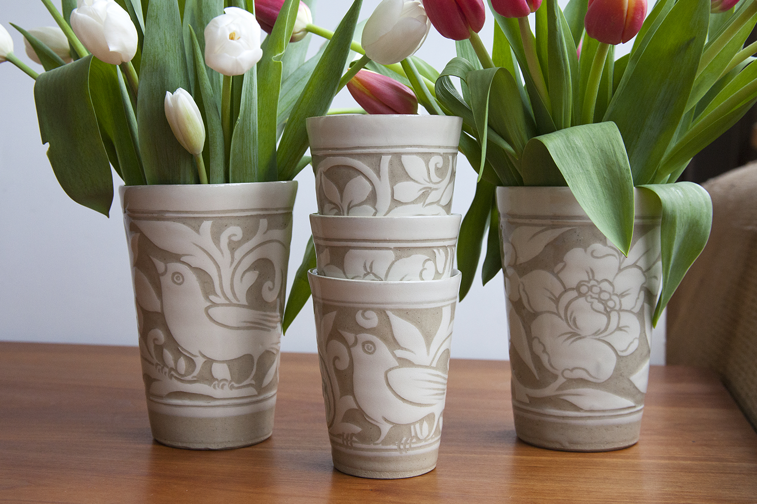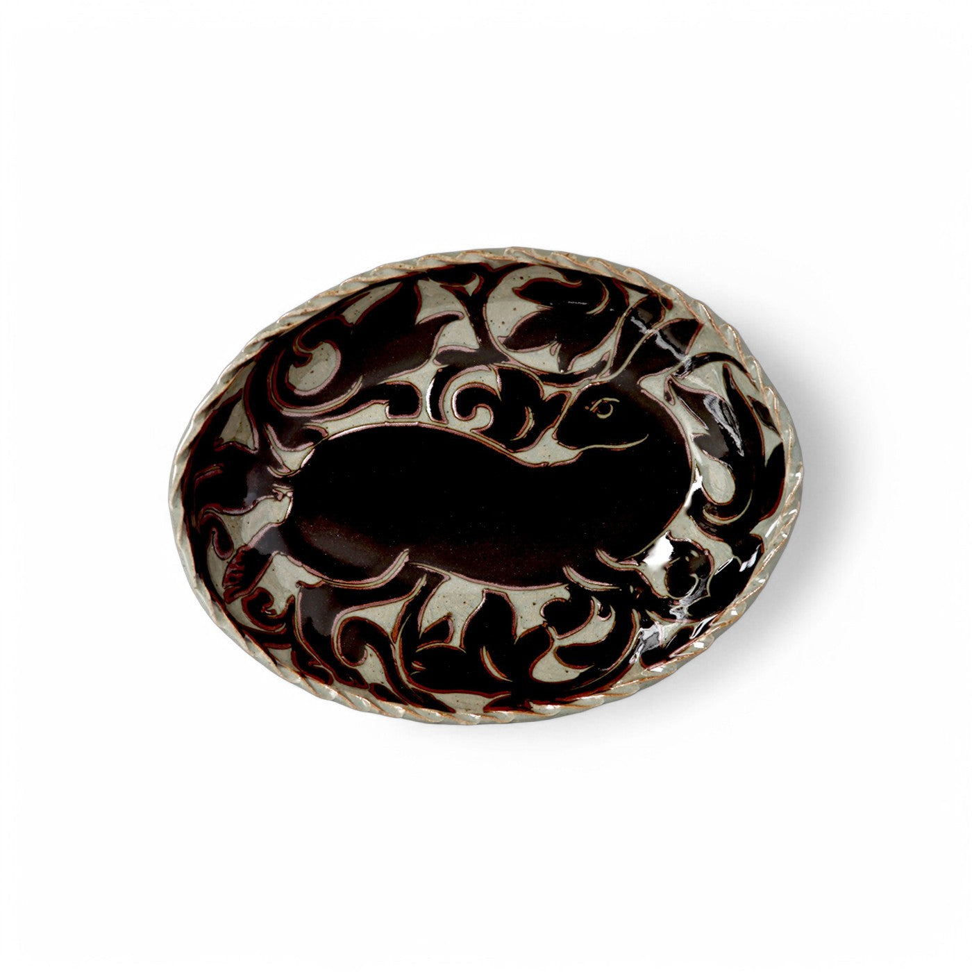 A variation on Miranda's signiture Black Carved collection, these pieces are drawn freehand then carved through a creamy layer of white clay slip. This reveals the soft, beige brown of the clay body beneath, giving a feeling of a two toned damask cloth.
