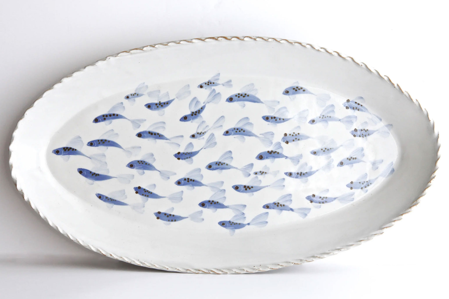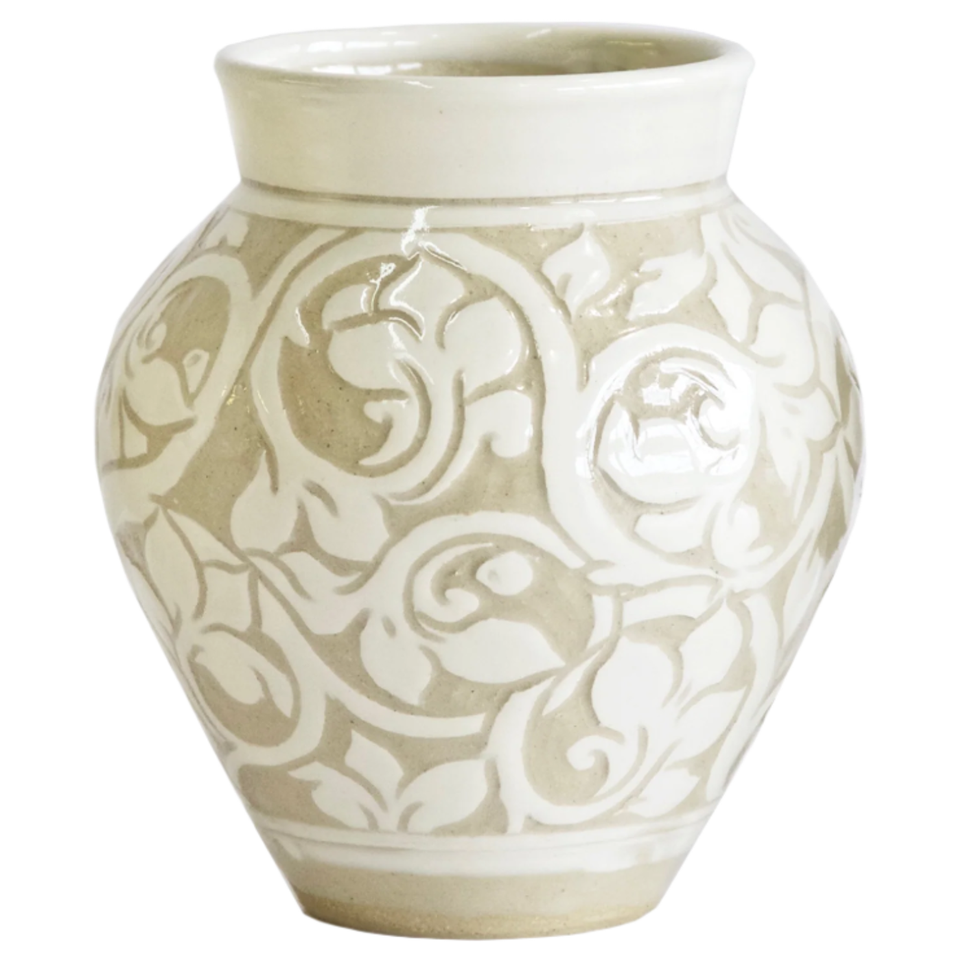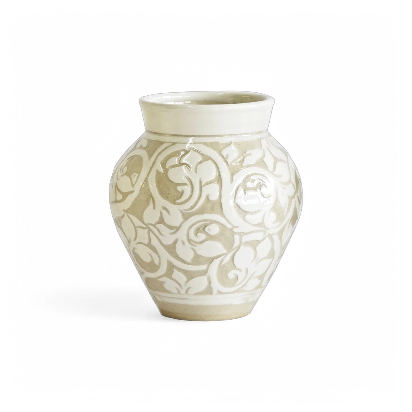 A variation on Miranda's signiture Black Carved collection, these pieces are drawn freehand then carved through a creamy layer of white clay slip. This reveals the soft, beige brown of the clay body beneath, giving a feeling of a two toned damask cloth.