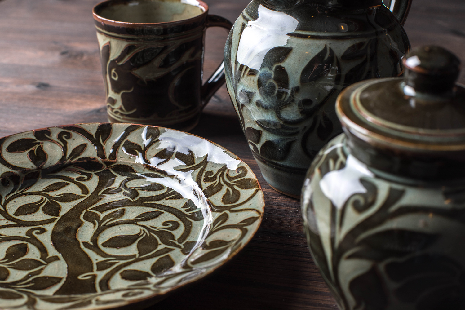 Then by firing the iron rich slip in a reducing kiln, and coating it in a Chun glaze, the smoke in the kiln transforms the rust layer to a range of rich blacks and browns. Sometimes, the iron is lustrous highlighting the edge of the carving. On the carved away areas the Chun glaze is a deep olive celadon, and where it pools, an opalescent blue. No two pots come out of the kiln alike. These have become Miranda’s signature pieces.