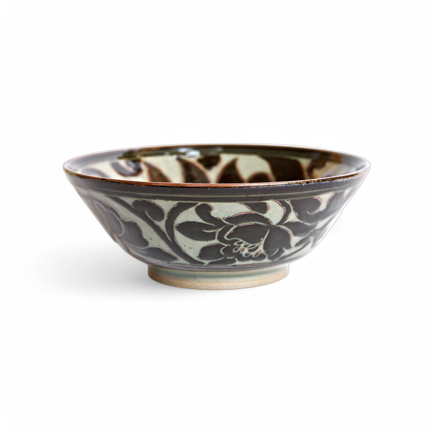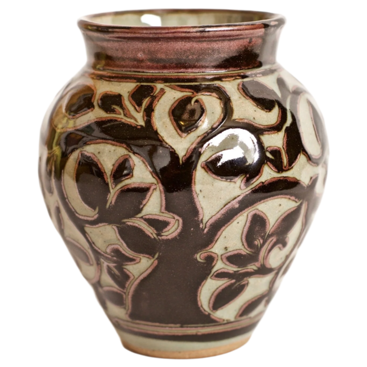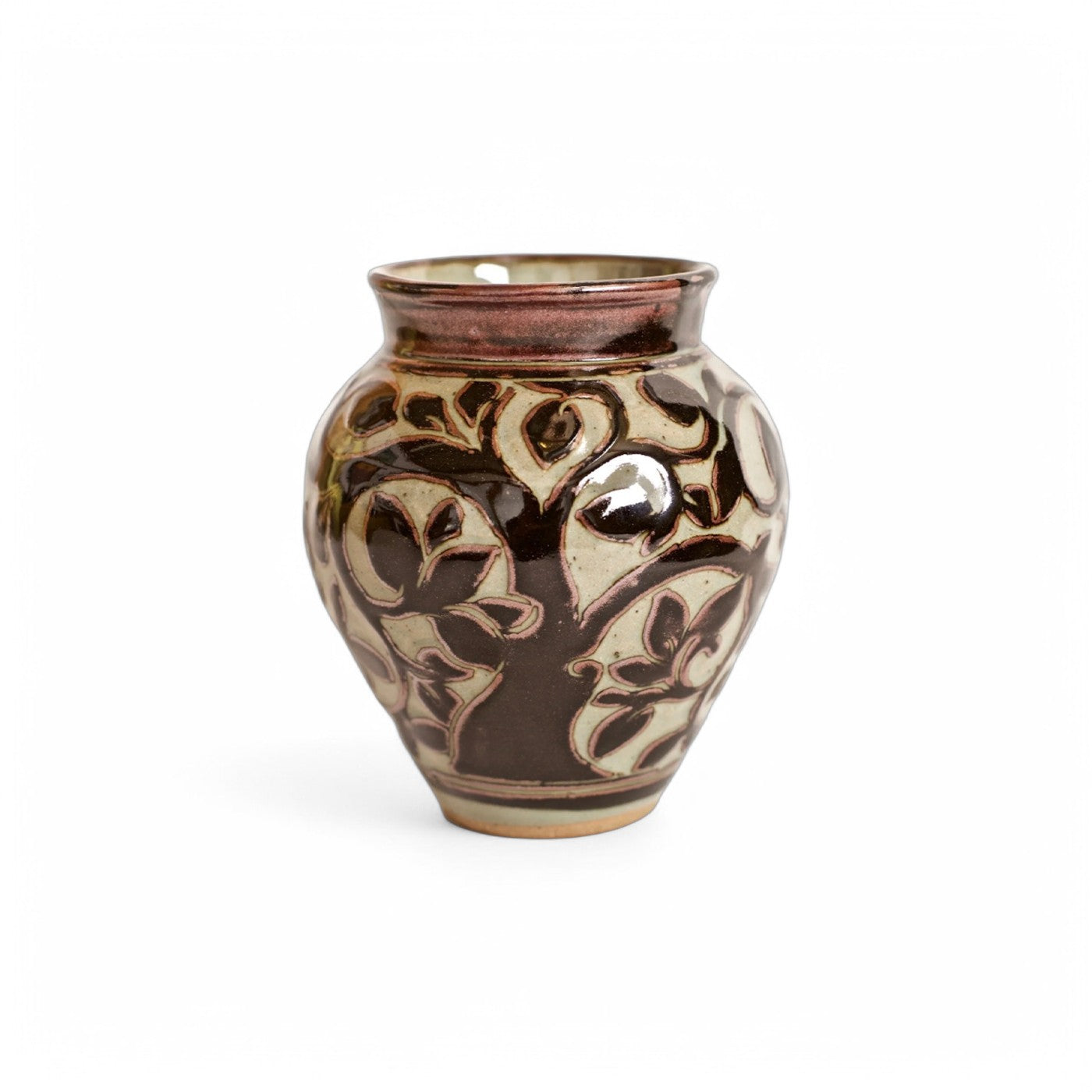 She noticed the Sung potters were drawing and carving through the slip layers at a later stage. These pots became her inspiration. This gave her carving a crisper cut, and showed the freehand drawing in a more defined way.