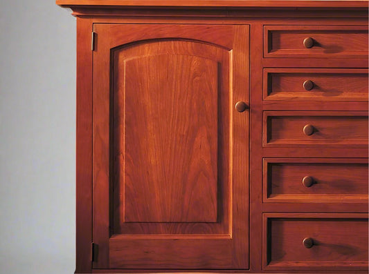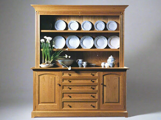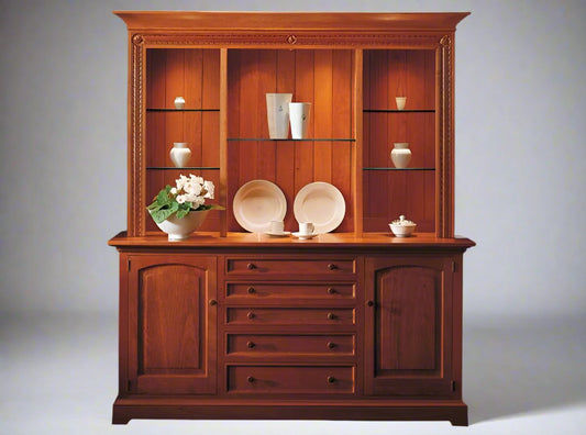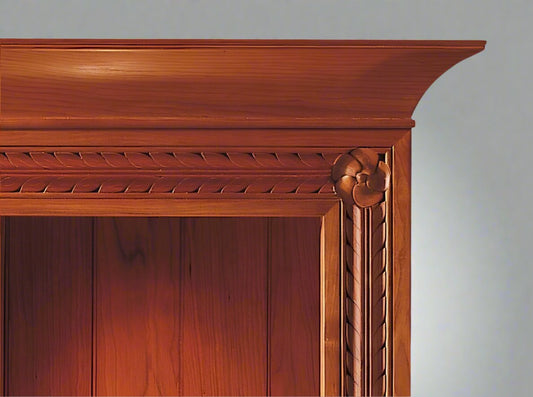 A decorative iteration of our kitchen dresser features Juliet’s rosettes and leaves will elevate any collection displayed on its shelves.