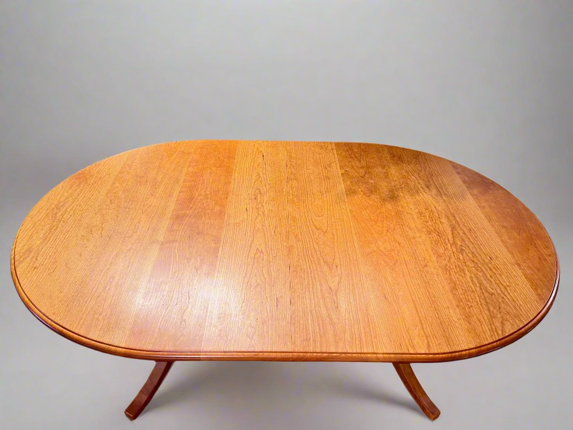 Hand-carved legs and hand-turned columns form two bases. The top features a thumbnail edge that echoes the bead at the base.