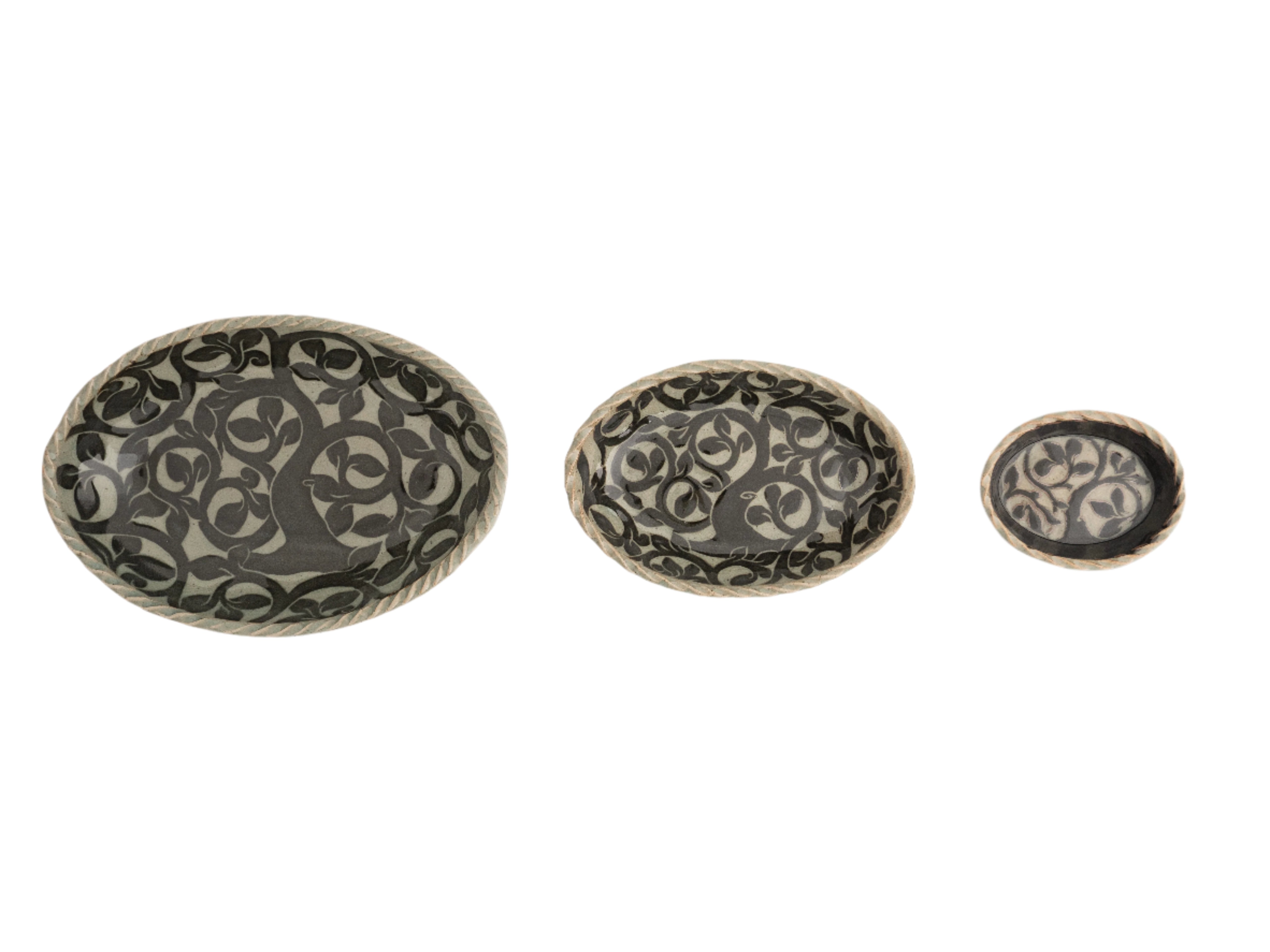 Every platter is individually hand thrown, dipped in slip, freehand decorated and carved. Each one is a true original, therefore no two are exactly alike.
