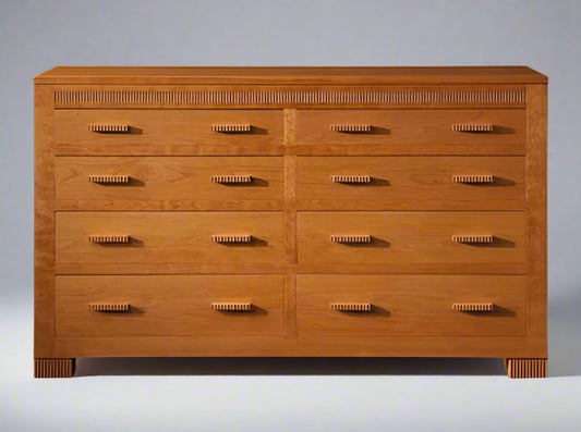 Straight edged and upright, our Modern Classic chest of drawers has a plain square edge top with a reveal that appears to float above the graduated drawers. Hand carved fluting along the top, on the pulls and feet reinforces the straight lines of this dramatic pieces.
