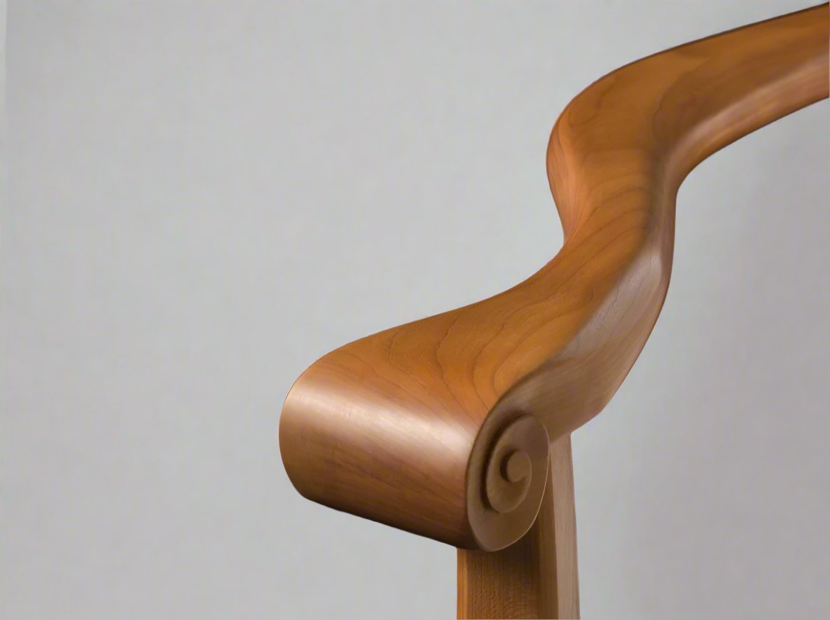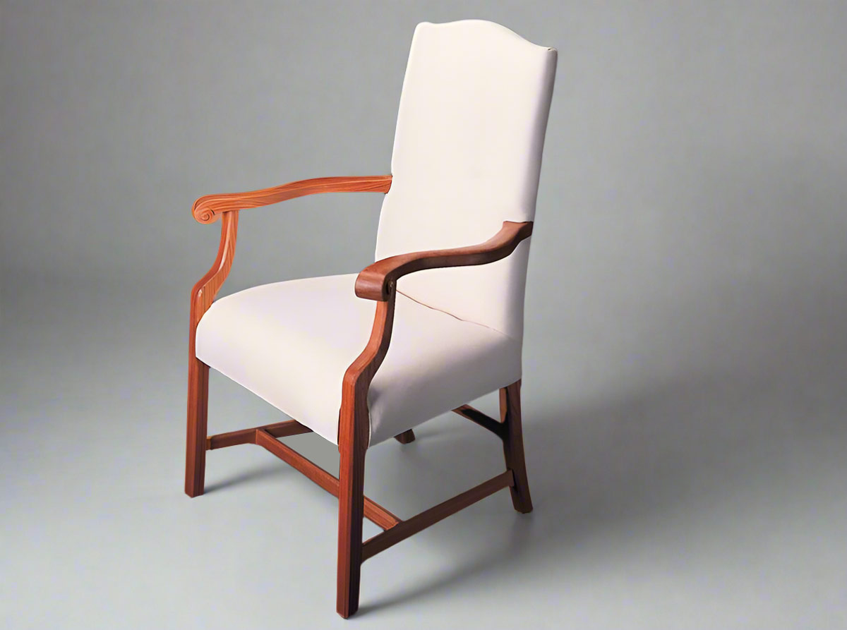Comfy Pomfret Chair is equally at home at the head of the table or fireside. Features sinuous hand-carved arms with curls and arched top of the upholstered back