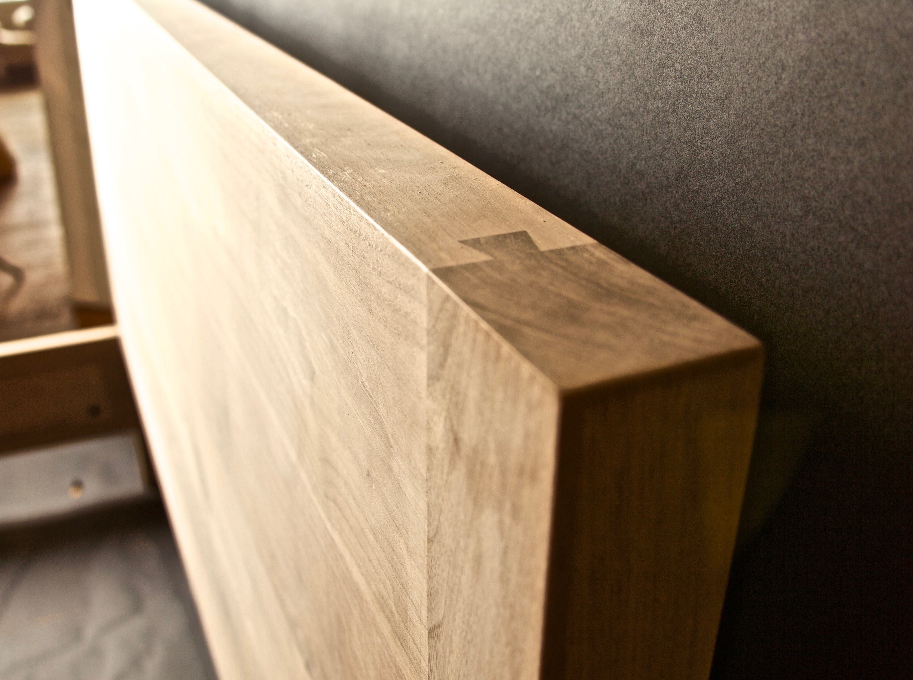 A modern design that shows off the beauty of the wood and exposed dovetail joints at the breadboarded ends of the panel head and footboards.