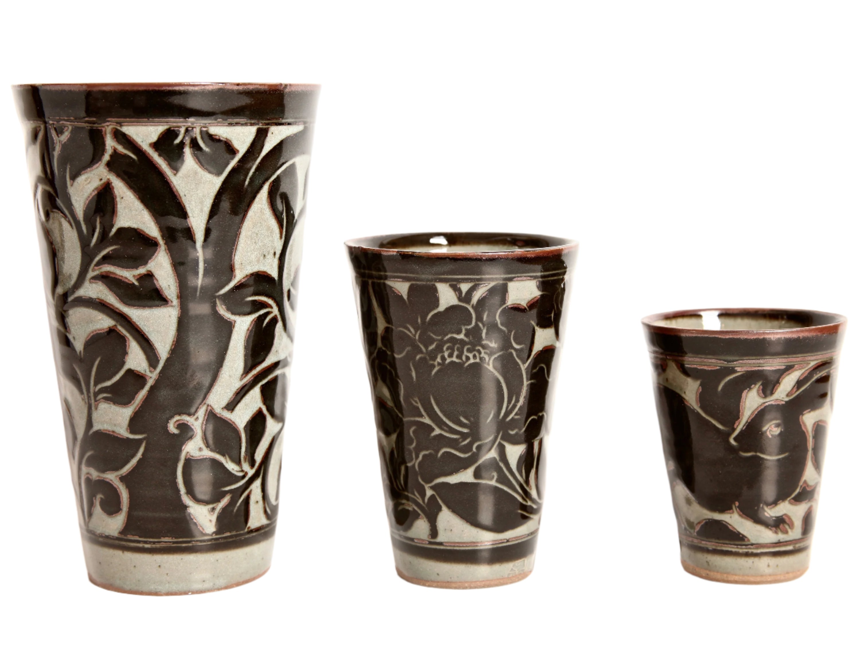 Every beaker is individually hand thrown, dipped in slip, freehand decorated and carved. Each one is a true original, therefore no two are exactly alike.